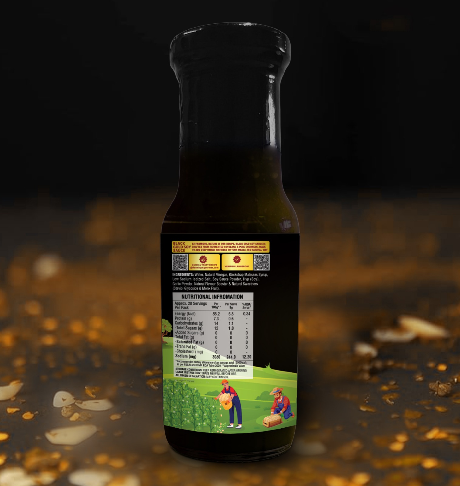 Farmique Black Gold Soy Sauce is a rich and flavour-packed condiment made from fermented soybeans and pure natural ingredients, delivering a deep and bold umami taste with an authentic Asian flavour. Crafted using a blend of natural vinegar, blackstrap molasses syrup, garlic powder, soy sauce powder, and low-sodium iodized salt, it enhances the taste of every dish without the use of artificial additives. This premium soy sauce is gluten-free, preservative-free, sugar-free, and palm-oil-free, making it a healthier and more natural choice for everyday cooking. Perfect for stir-fries, marinades, sautéing, dipping, and seasoning, it adds smooth savoury richness to meals.