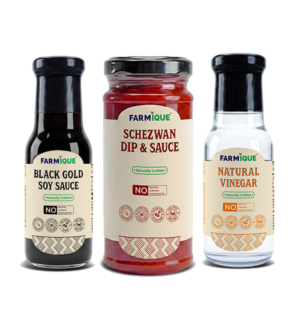 The Farmique Combo featuring Fiery Schezwan Sauce, Black Gold Soy Sauce, and Natural Vinegar is a versatile trio crafted to bring bold flavour, rich umami, and balanced tang to your everyday cooking. Made using carefully selected natural ingredients, this combo delivers authentic Indo-Chinese taste with a perfect blend of spice, depth, and freshness. All three products are free from artificial additives, preservatives, MSG, gluten, added sugar, and palm oil, making them a healthier choice for modern kitchens. Ideal for stir-fries, noodles, fried rice, marinades, sauces, dressings, and dipping, this combo enhances a wide range of dishes with ease.