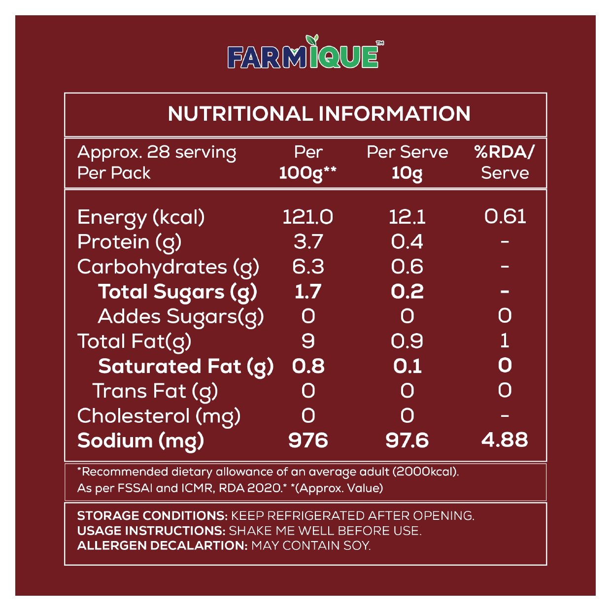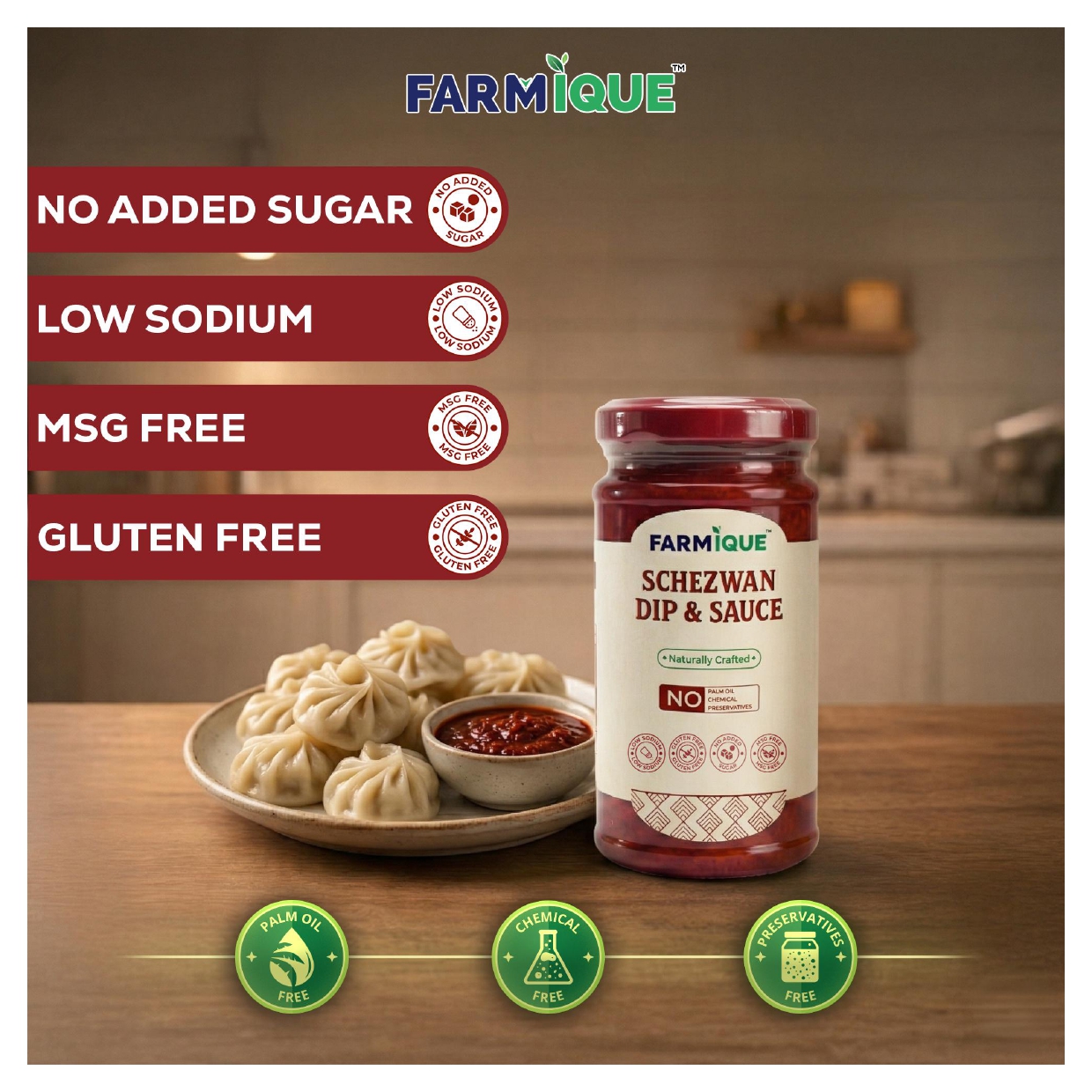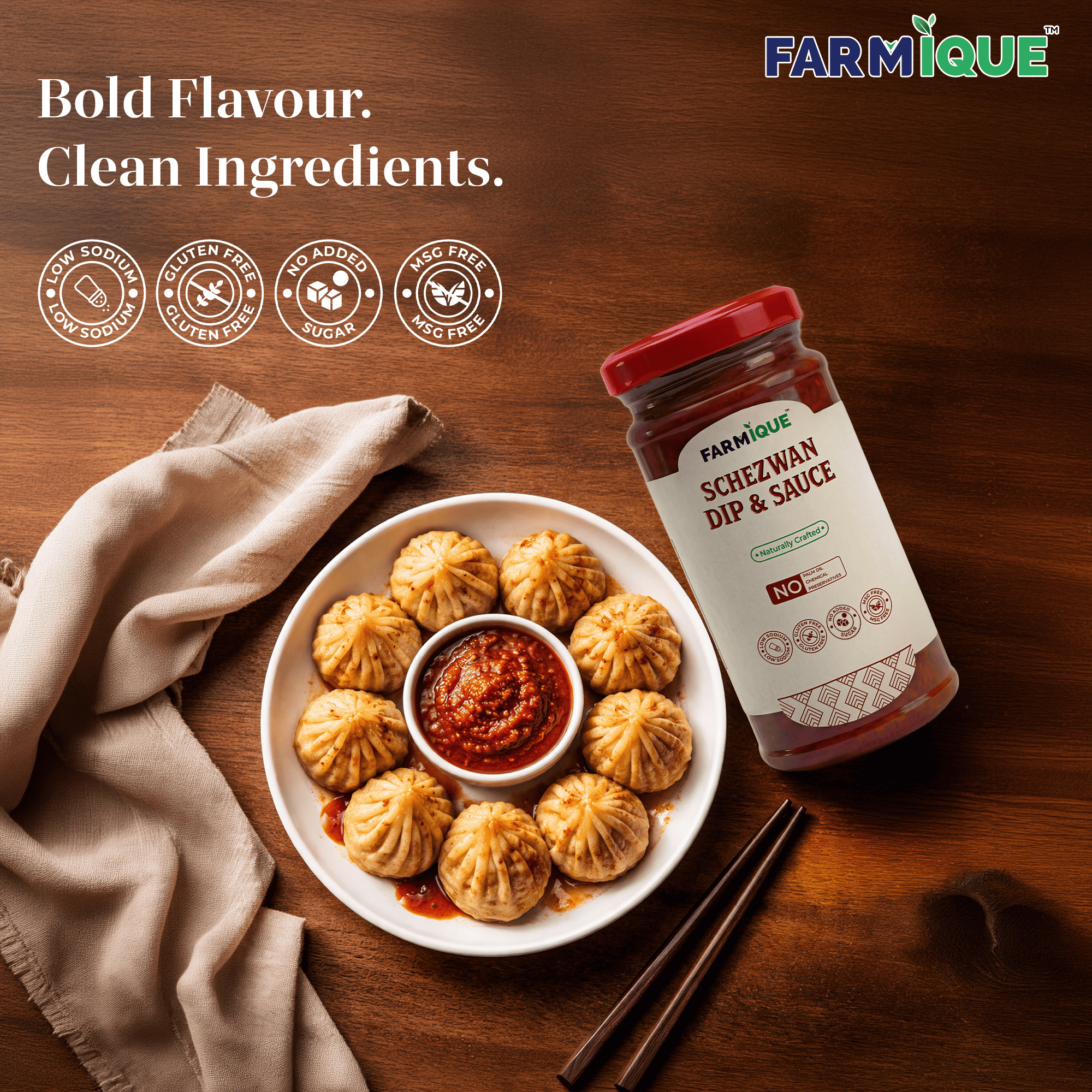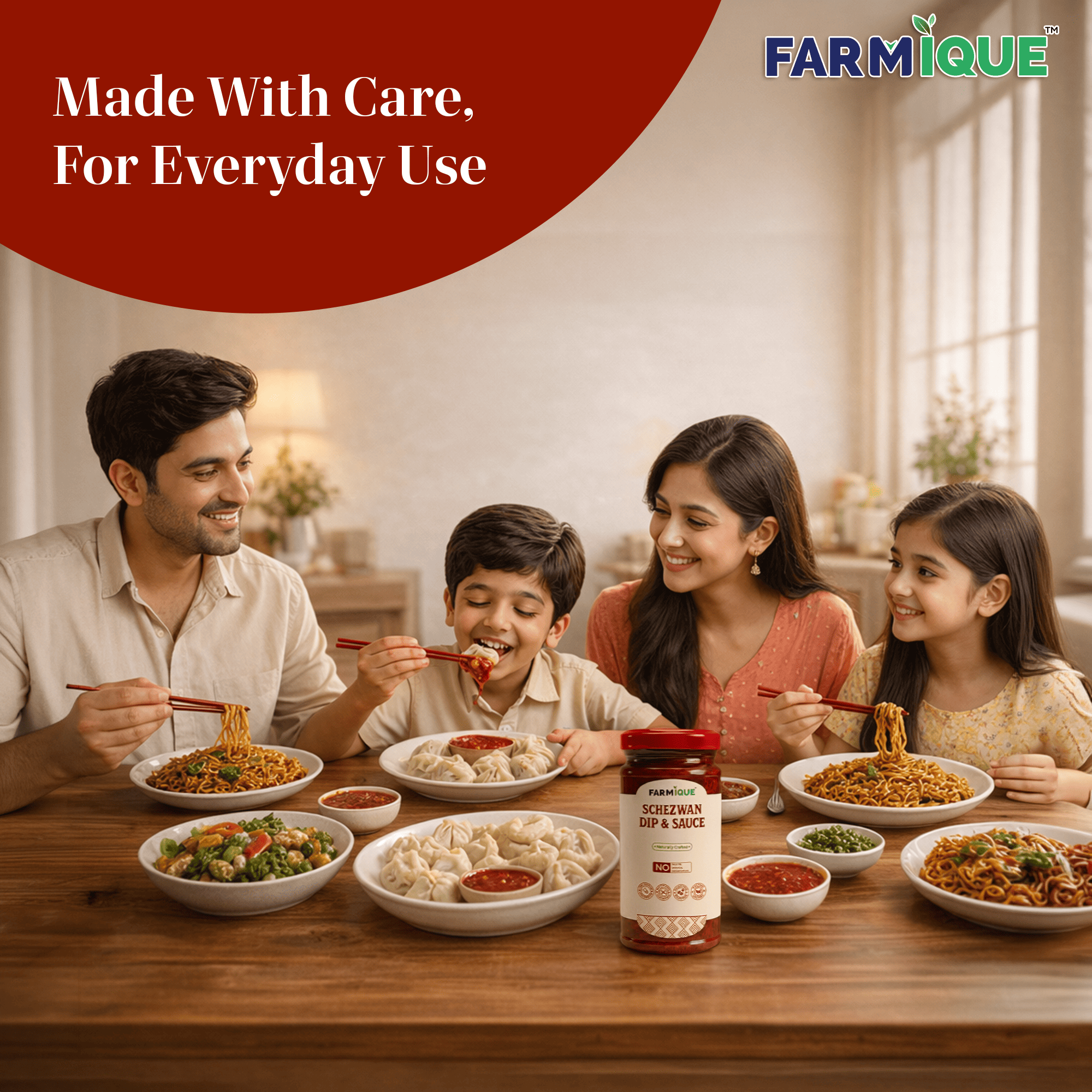 Farmique Fiery Schezwan Sauce is a bold and flavour-rich condiment crafted using farm-fresh red chillies, garlic, and aromatic spices to deliver an authentic Indo-Chinese taste. Made with natural ingredients and sunflower oil, this sauce offers a perfect balance of heat, tang, and savoury goodness without the use of artificial additives. It is 100% chemical free, gluten free, MSG free, low in sodium, and contains no added sugar or palm oil, making it a healthier choice for everyday meals. Ideal for noodles, fried rice, momos, stir-fries, marinades, and as a dipping sauce, it instantly adds a fiery kick and rich flavour to your dishes.