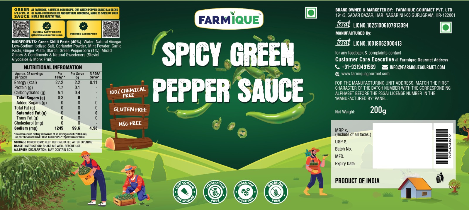 Farmique Spicy Green Pepper Sauce is a vibrant and flavour-packed condiment made from farm-fresh green chillies, with 40% green chilli paste that delivers a fresh, zesty heat in every bite. Carefully crafted using natural ingredients, this sauce is 100% chemical free and contains no added sugar, preservatives, MSG, gluten, or palm oil, making it a healthier choice for everyday consumption. Balanced with natural vinegar, herbs, and spices, it offers a smooth, tangy, and mildly spicy taste that enhances a wide range of noodles. Perfect as a dip, spread, or cooking sauce, it pairs exceptionally well with noodles, momos, sandwiches, wraps, grilled foods, and stir-fries.