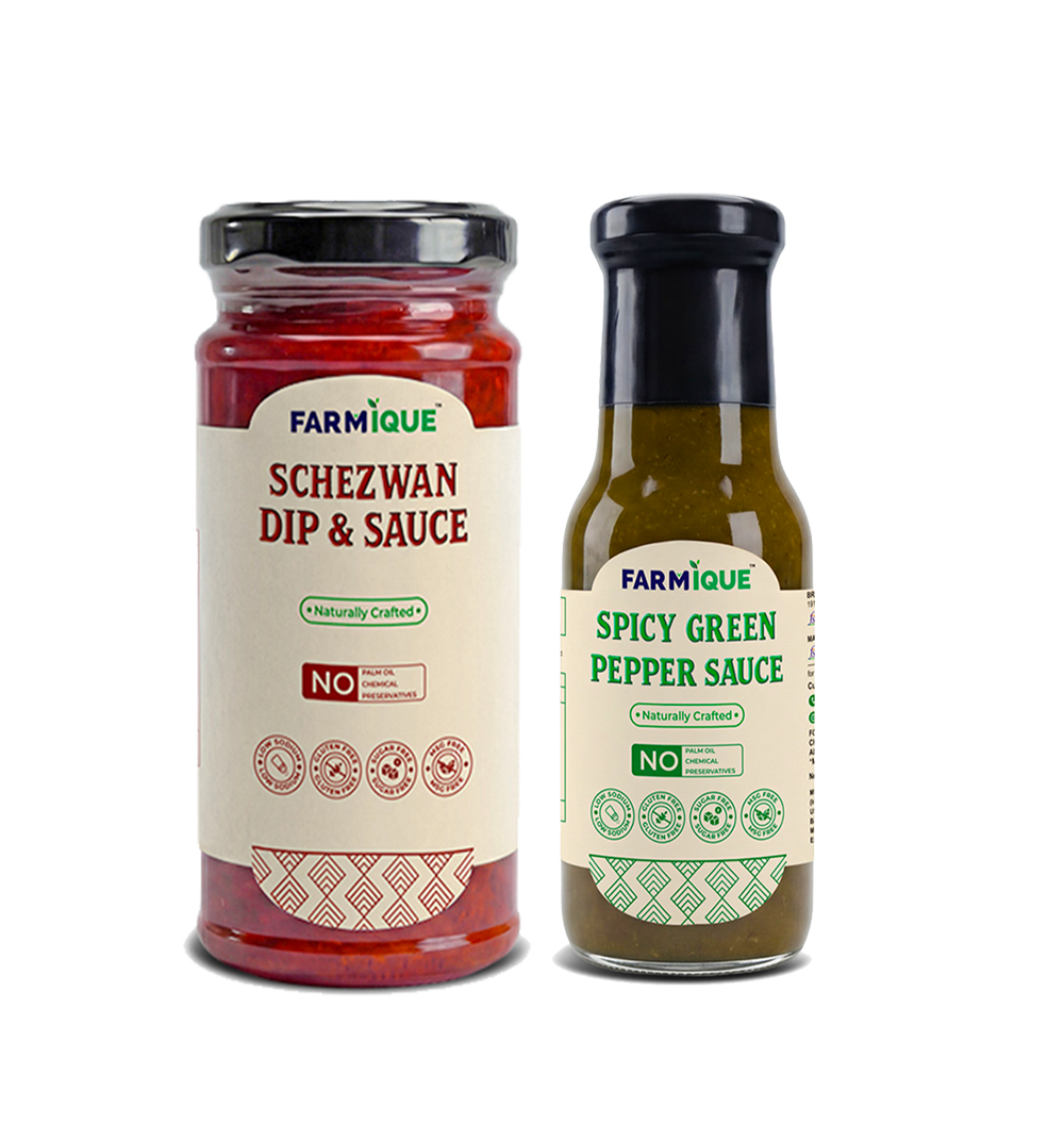The Farmique Combo of Spicy Green Pepper Sauce and Fiery Schezwan Sauce is a perfect pairing for lovers of bold, spicy flavours. Crafted using farm-fresh chillies, aromatic spices, and natural ingredients, this combo delivers a vibrant mix of fresh green heat and fiery Indo-Chinese taste. Both sauces are 100% chemical free and contain no added sugar, preservatives, MSG, gluten, or palm oil, making them a healthier choice for everyday cooking. Ideal for noodles, fried rice, momos, stir-fries, marinades, and dipping, this combo adds instant flavour, heat, and depth to your favourite dishes.